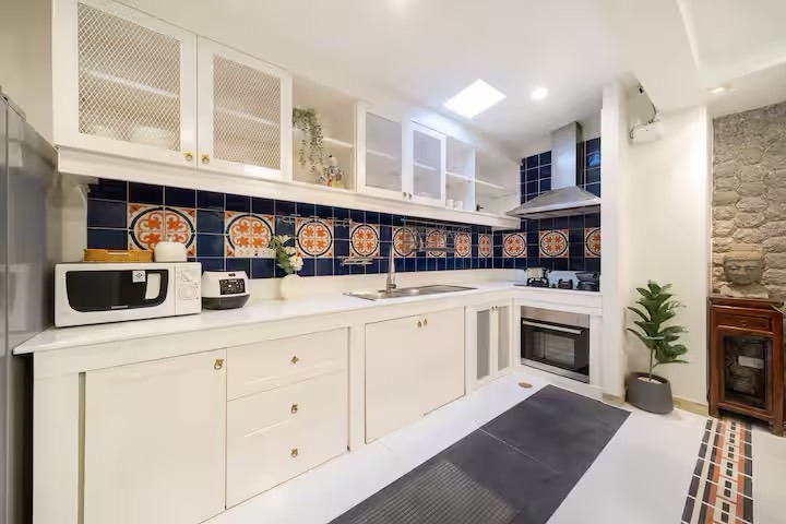 • 🍳 Fully equipped kitchen with fridge, microwave, stovetop, oven, coffee machine, kettle, toaster, rice cooker, cookware, and tableware