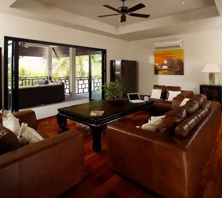 🎥 Large lounge area featuring 3 plush leather sofas and a state-of-the-art home theater system for perfect entertainment