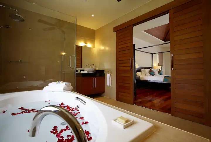 👗 Elegant walk-in closets with modern fixtures, a reading room, and a balcony lounge overlooking the pool and swaying coconut palms